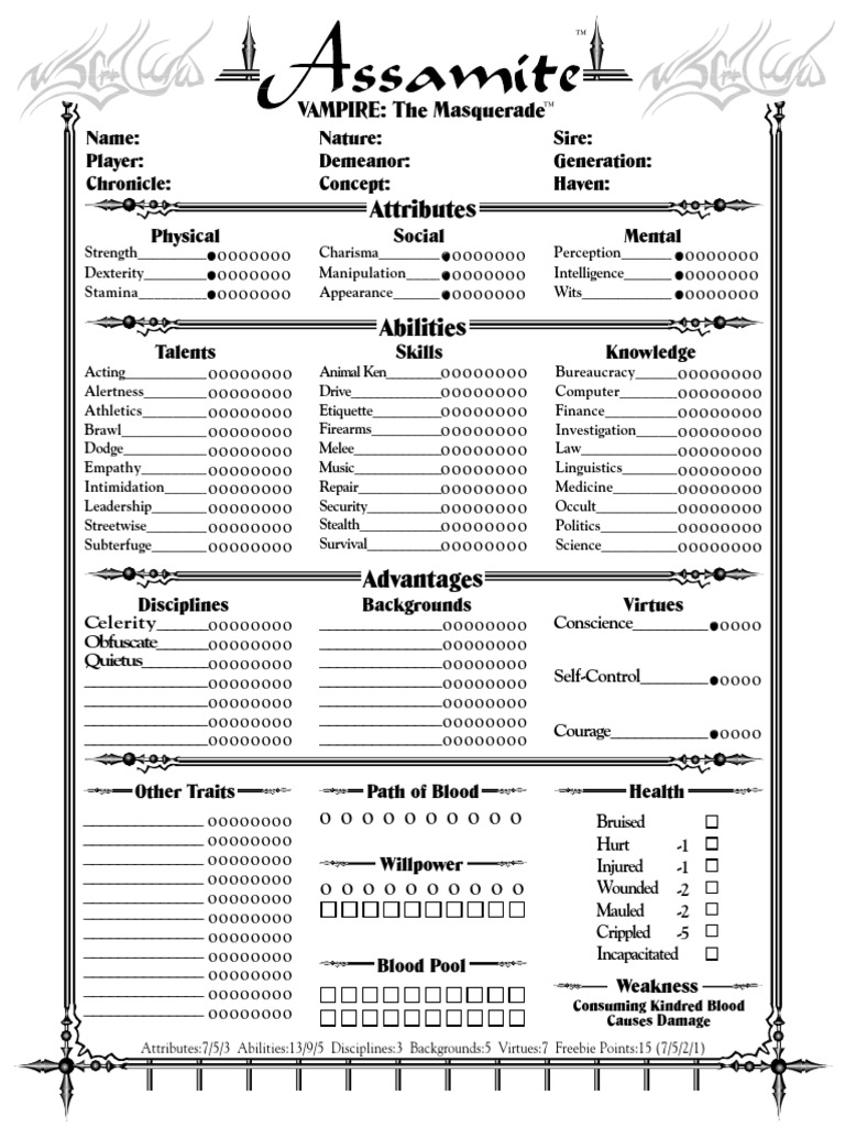 What i was wondering is does anyone know where i can find copies of the character sheets of the npcs (if they exist) or someone had already made a fan version? Here the player can add points to the desired attributes and traits when they gain enough experience. Gone made an alternative character sheet therefore any other has to be objectively better before you will download it. Our new digital character sheet for vampire the masquerade 5e allows you to create character and from there, it is as easy as filling out the character sheet! A community for collaborative character creation and trading, worldbuilding and roleplay.